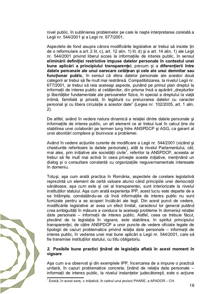 544/2001 privind liberul acces la informaţiile de interes public, cu modificările şi completările ulterioare. Solicitarea în scris poate fi transmisa exemplu solicitare acces la informatii. Centrul de documentare pentru legea 544 vă prezintă un ghid simplu de utilizare a drepului privind liberul acces la informaţii de interes public La mayoría de las sesiones de estos cuerpos colegiados son públicas, y sólo excepcionalmente se celebran en forma reservada o secreta. The national public interest requires that this be the case.