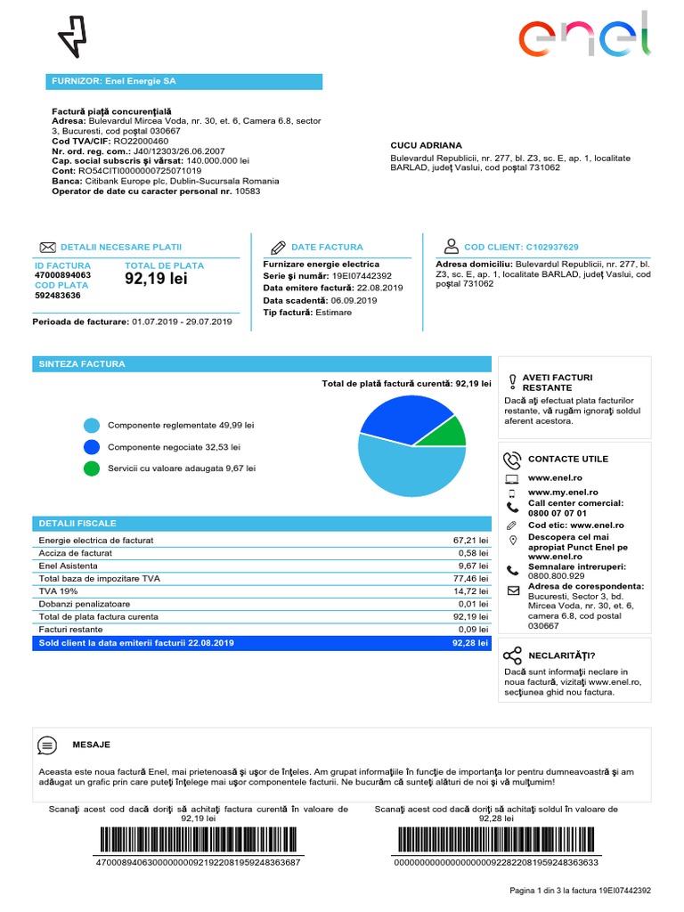 Inainte de a discuta efectiv despre pret pe kilowatt in 2020, trebuie sa precizam cateva aspecte foarte la pretul pe kwh de mai sus, se adauga un abonament orar de 0.02 ron. Dacă ești deja clientul nostru sau vrei să devii clientul nostru, oferta enel protect 360 este ideală: Sul listino enel energia sono comunque presenti molte altre soluzioni per venire incontro alle innumerevoli esigenze degli utenti, dalle tariffe più convenienti durante le ore serali e nei weekend alle offerte fisse, fino a tariffe personalizzate in base alla città in cui si vive. Mesaje aceasta este noua factură enel, mai prietenoasă şi uşor de înţeles. In its journey to achieve complete decarbonization by 2050, enel created a roadmap with interim objectives, certified by the science based targets initiative (sbti), with a projected reduction of 70% in direct greenhouse gas emissions per kwh in 2030 with respect to 2017 levels, until reaching 125.