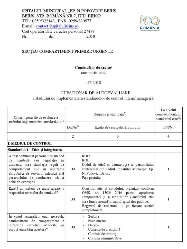 vizitati articolul complet aici : 2 Operaționali sunt clar definite în fişele. Scim aplică prevederile și normele cuprinse ordinul sgg 600/2018 pentru aprobarea codului. Once the internal managerial control is implemented, the responsibility of management is that of identifying all the deviations from the objectives noticed at the end of the control activities, of analysing the causes that determined their appearance and of deciding upon the necessary preventive and.