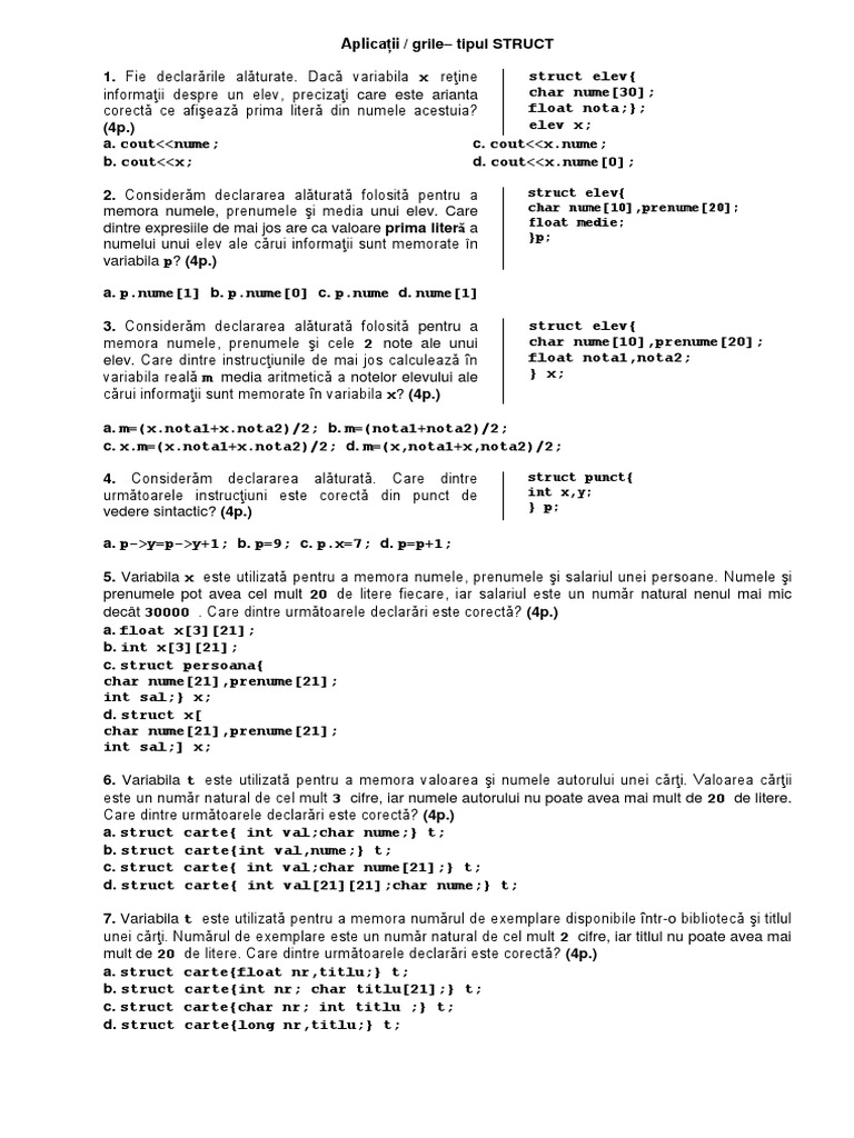 vizitati articolul complet aici : https://www.yumpu.com/ro/document/view/15867788/programare-orientata-obiect-c-2005-2006 Aceste elemente sunt denumite „membrii si pot avea. A struct in the c programming language (and many derivatives) is a composite data type (or record) declaration that defines a physically grouped list of variables under one name in a block of memory, allowing the different variables to be accessed via a single pointer or by the struct declared name. Struct autoturism{char marca21;int anul_fabricatiei} x;