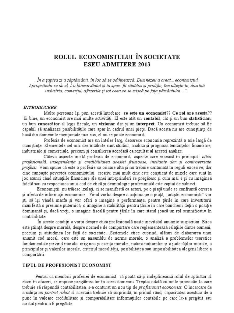 El este atât un contabil, cât și un bun statistician, un bun cunoscător al legii economistul are rolul de a aduce previziuni în legătură cu schimbările din cadrul unei piețe. Ei bine, un economist are mai multe activități. Un economist trebuie s fie capabil s analizeze posibilitile care apar n cadrul unei piee.